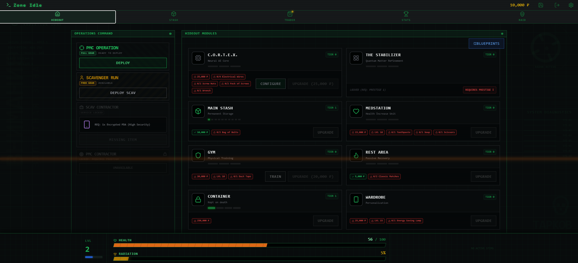 Wow thank you so much! I just pushed out another little update that adds some idle features accessible in the hideout. I really appreciate the feedback, feel free to lmk if you have any suggestions!
